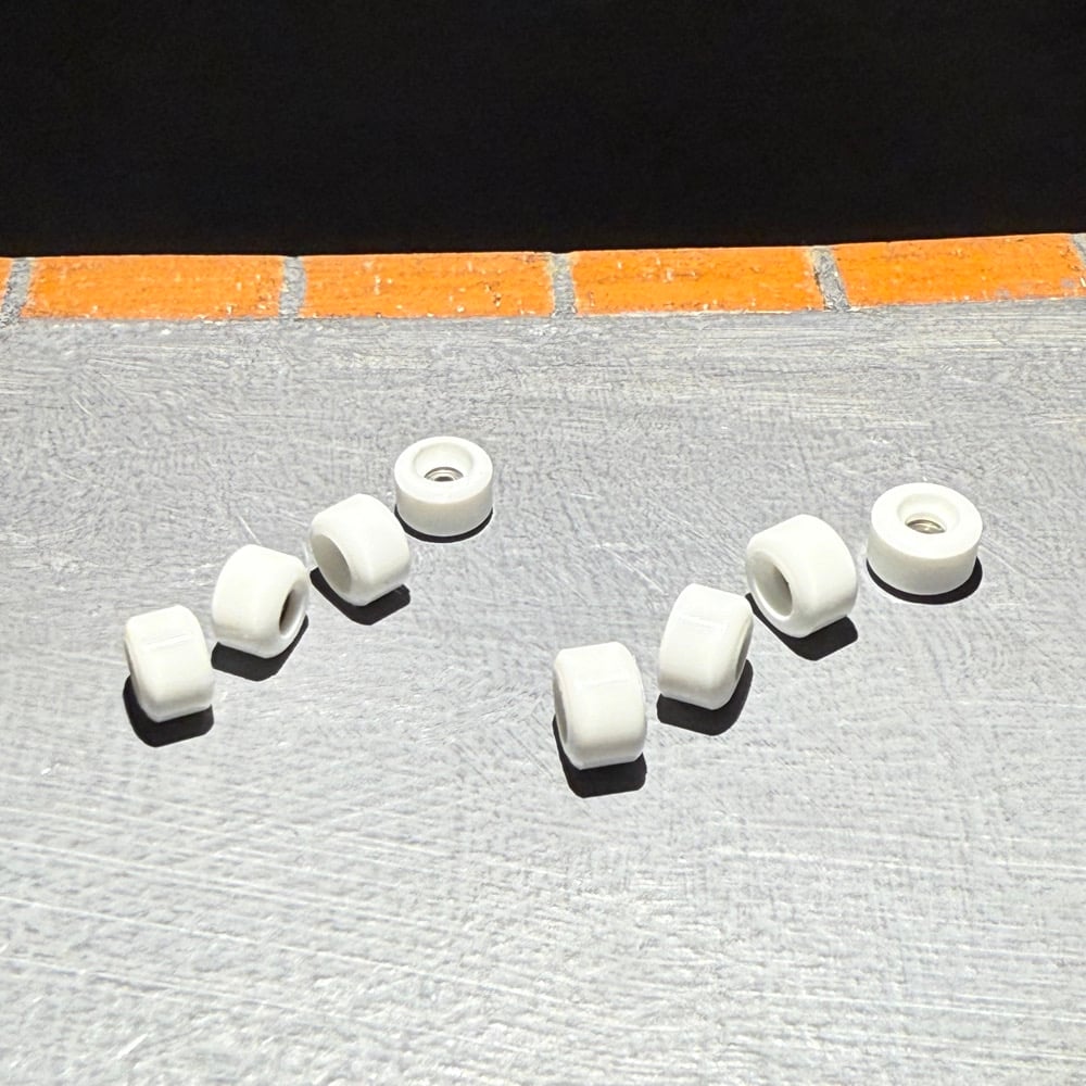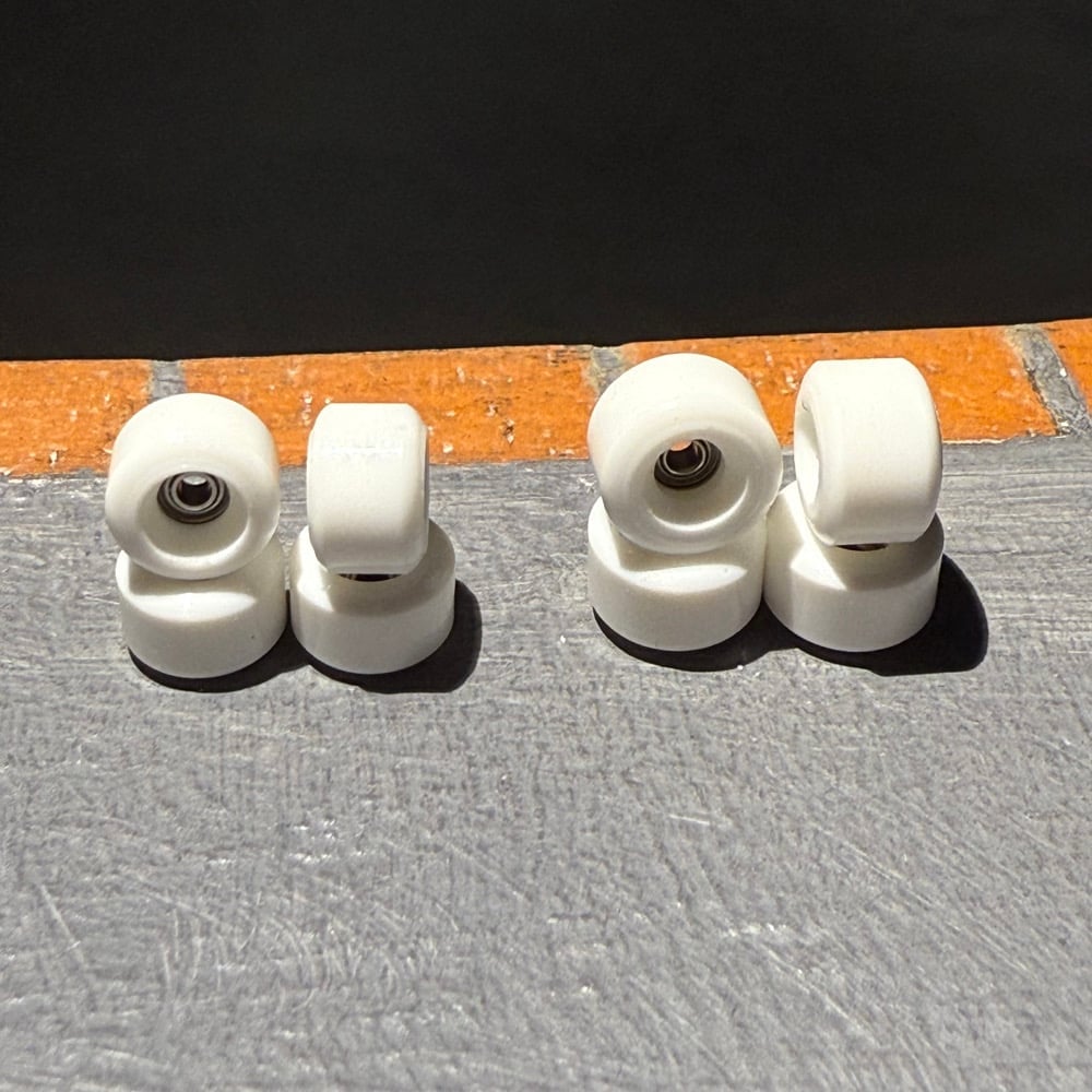 Vivid Wheels, urethane fingerboard wheels fitted with high quality greased bearings. Each set contains 4 wheels and one sticker sheet.